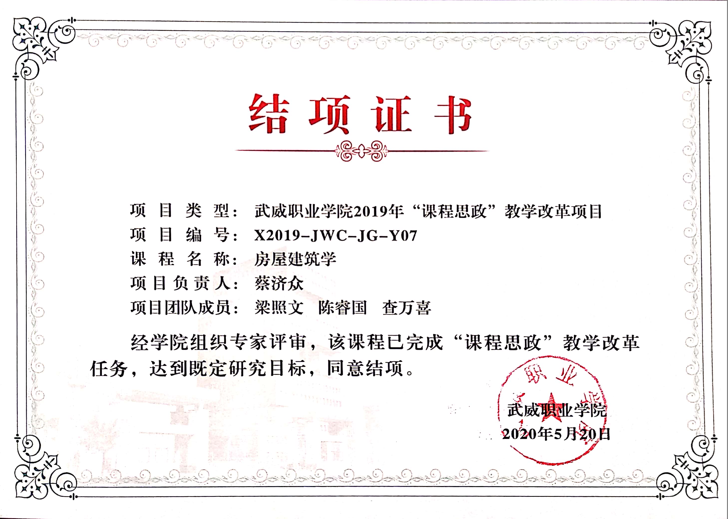 26.2020年項(xiàng)目組成員蔡濟(jì)眾、陳睿國主持完成《房屋建筑學(xué)》課程思政改革? 結(jié)項(xiàng) 【結(jié)項(xiàng)證書】
