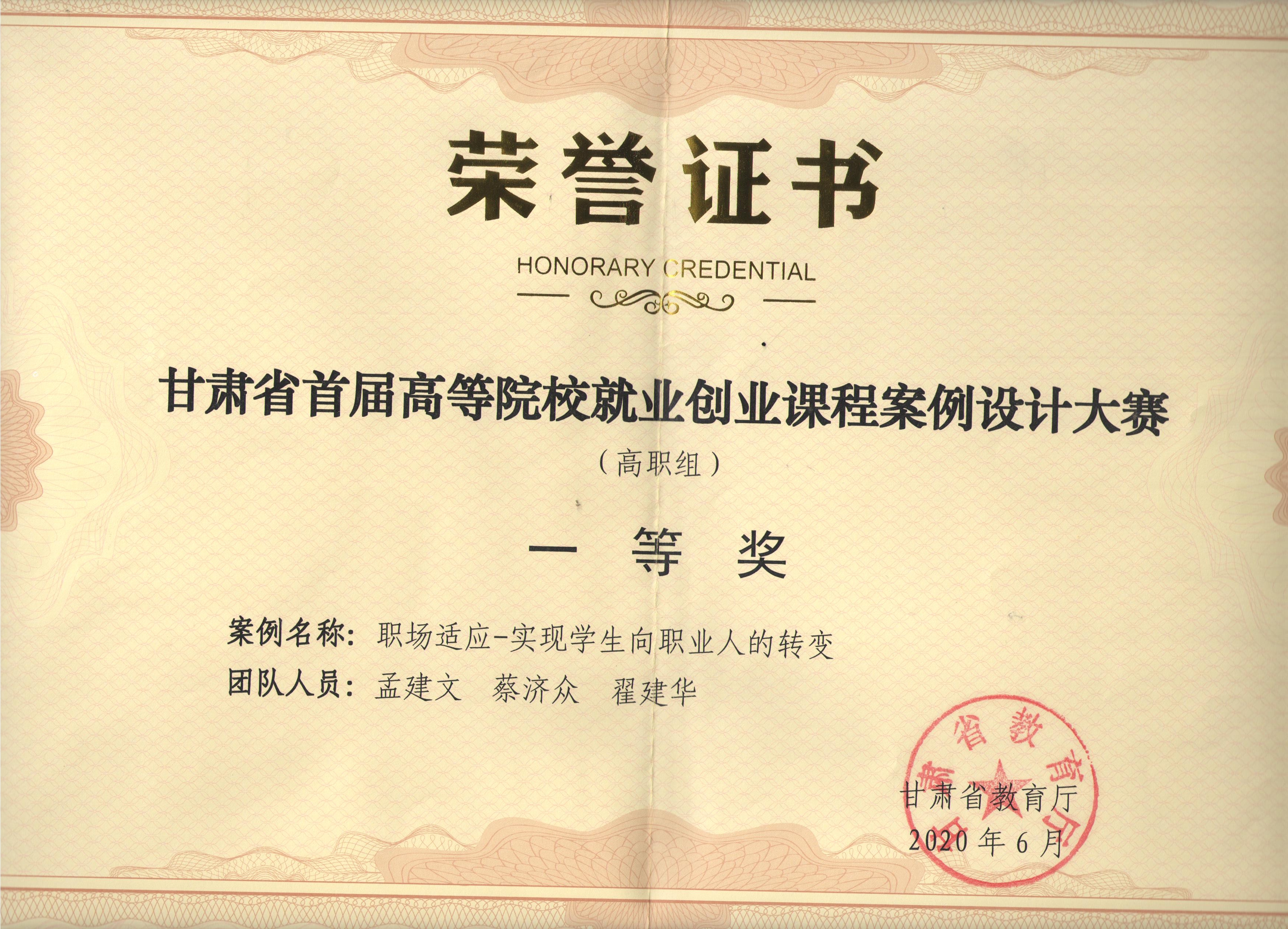 項(xiàng)目組成員蔡濟(jì)眾2020年6月撰寫案例《職場(chǎng)適應(yīng)—實(shí)現(xiàn)學(xué)生向職業(yè)人的轉(zhuǎn)變》榮獲甘肅省首屆高等院校就業(yè)創(chuàng)業(yè)課程案例設(shè)計(jì)大賽(高職組)一等獎(jiǎng)