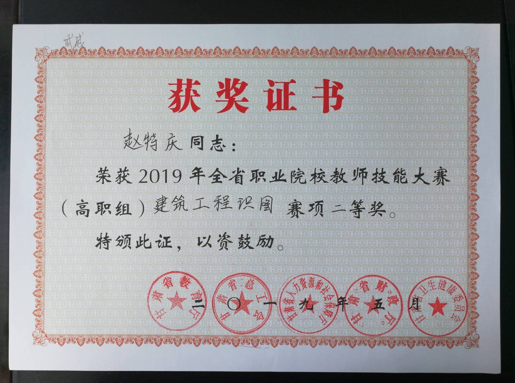 項(xiàng)目組成員趙特慶2019年5月榮獲2019年全省職業(yè)院校教師技能大賽(高職組)建筑工程識(shí)圖賽項(xiàng)二等獎(jiǎng)