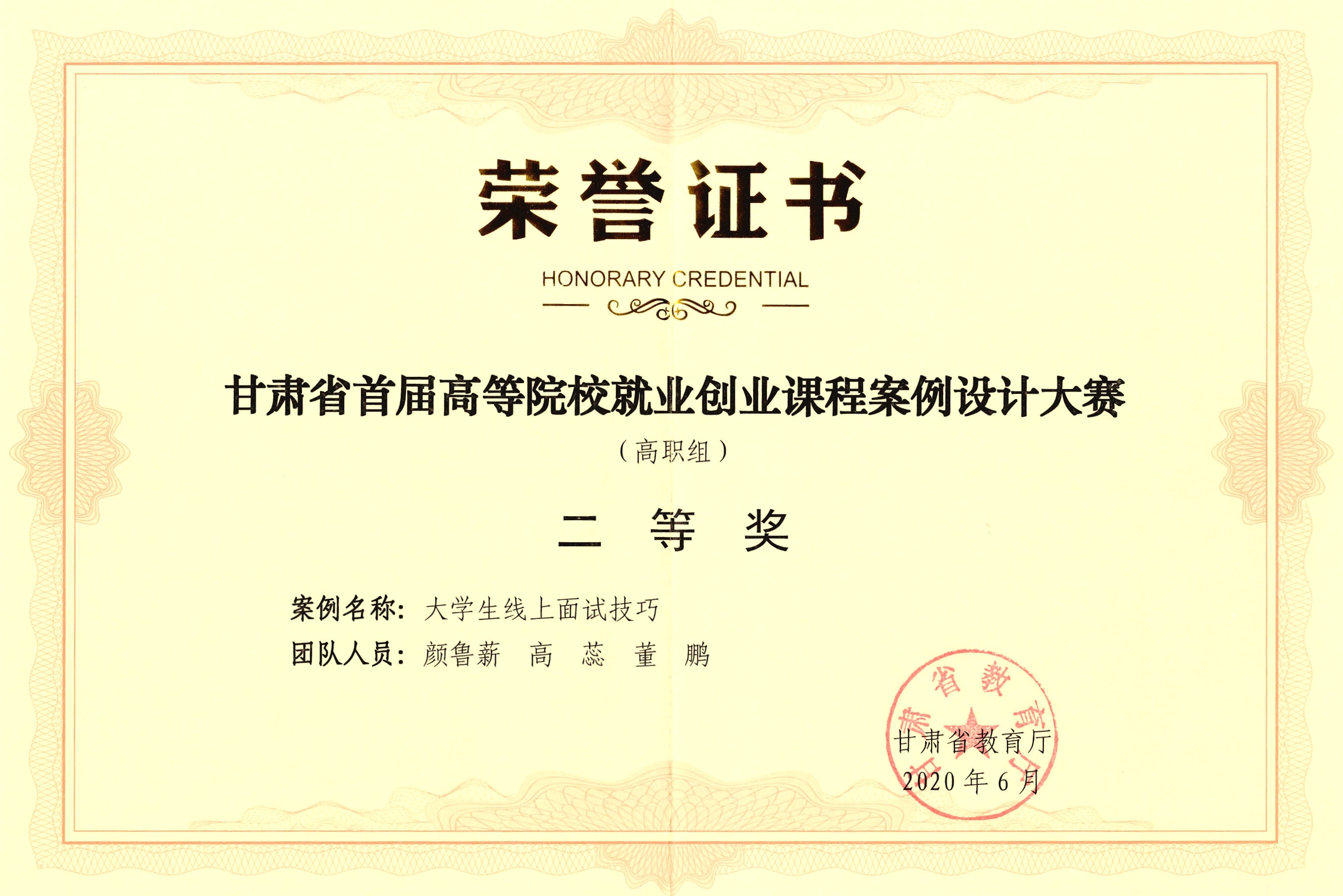 3.項(xiàng)目組成員董鵬2020年6月撰寫案例《大學(xué)生線上面試技巧》榮獲甘肅省首屆高等院校就業(yè)創(chuàng)業(yè)課程案例設(shè)計(jì)大賽(高職組)二等獎(jiǎng)