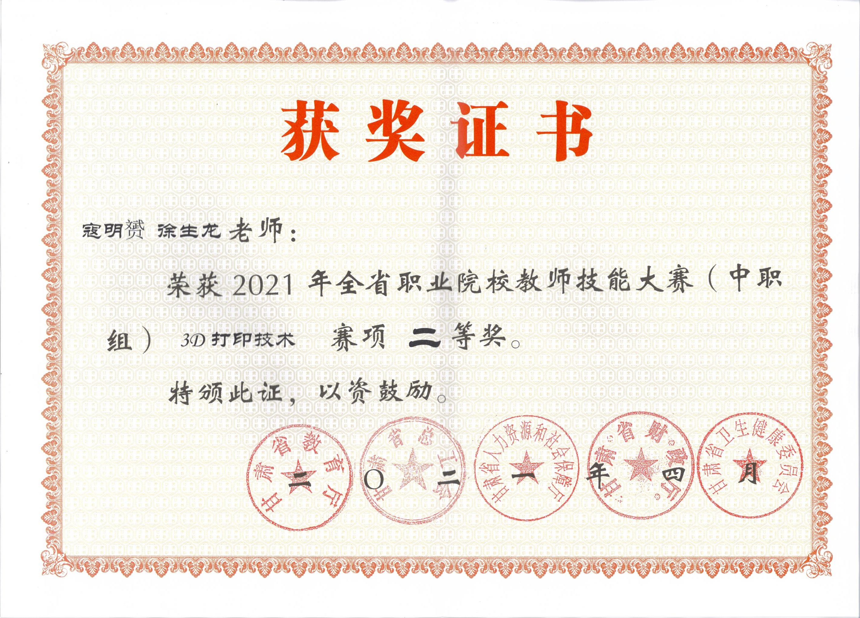 4.項(xiàng)目組負(fù)責(zé)人徐生龍2021年4月獲甘肅省技能大賽二等獎(jiǎng)
