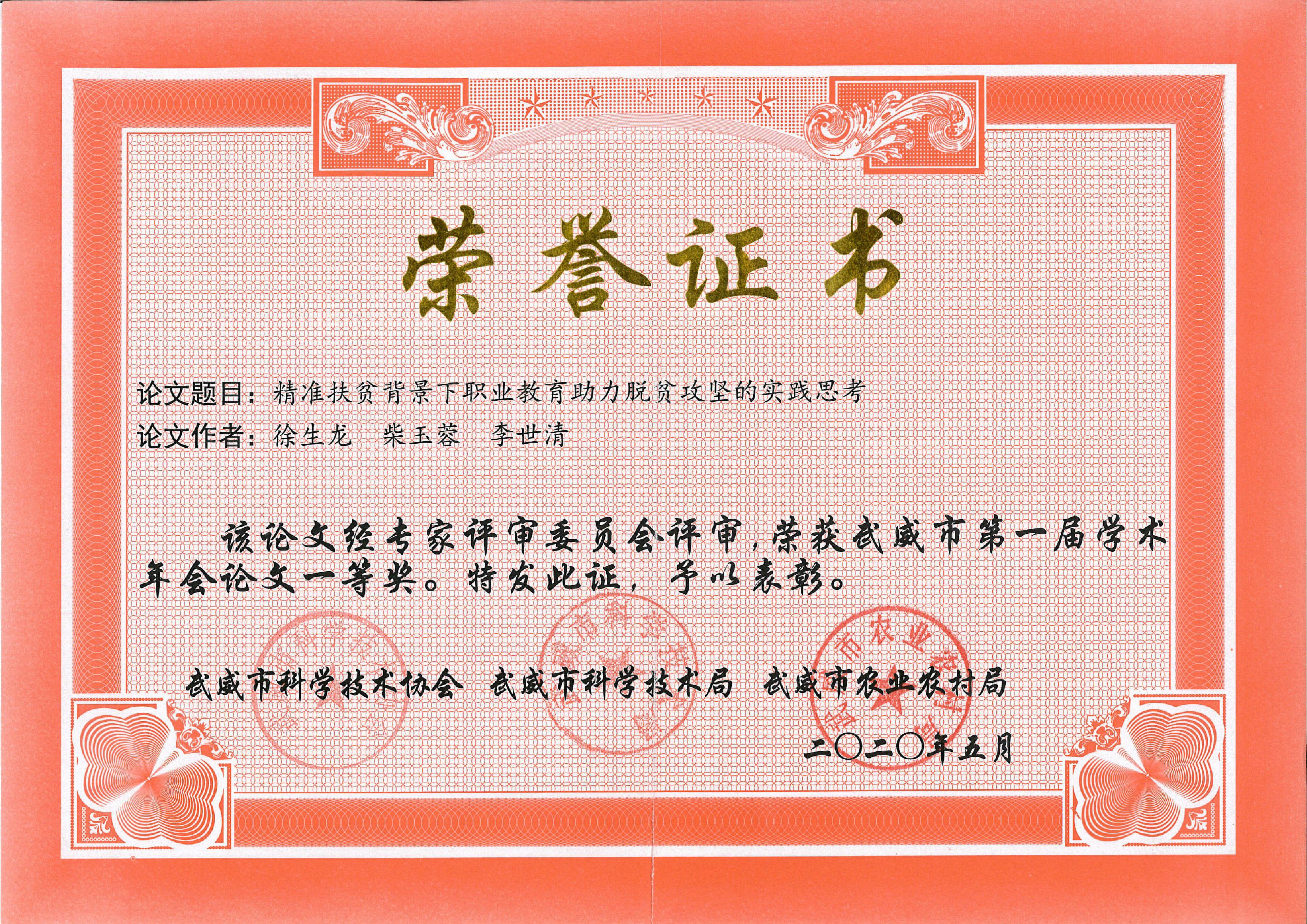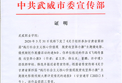 項(xiàng)目組成員徐生龍撰寫的論文《精準(zhǔn)扶貧背景下職業(yè)教育助力脫貧攻堅(jiān)的實(shí)踐思考》被評(píng)為武威市第一屆學(xué)術(shù)年會(huì)論文一等獎(jiǎng)