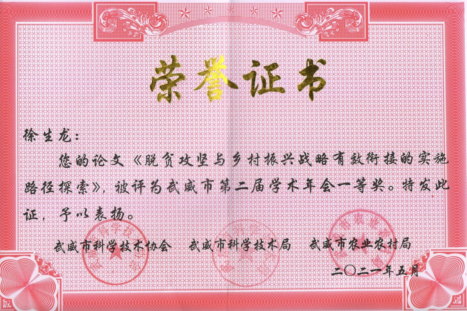 8.項(xiàng)目負(fù)責(zé)人徐生龍撰寫的論文《脫貧攻堅(jiān)與鄉(xiāng)村振興戰(zhàn)略有效銜接的實(shí)施路徑探索》被評(píng)為武威市第二屆學(xué)術(shù)年會(huì)一等獎(jiǎng)