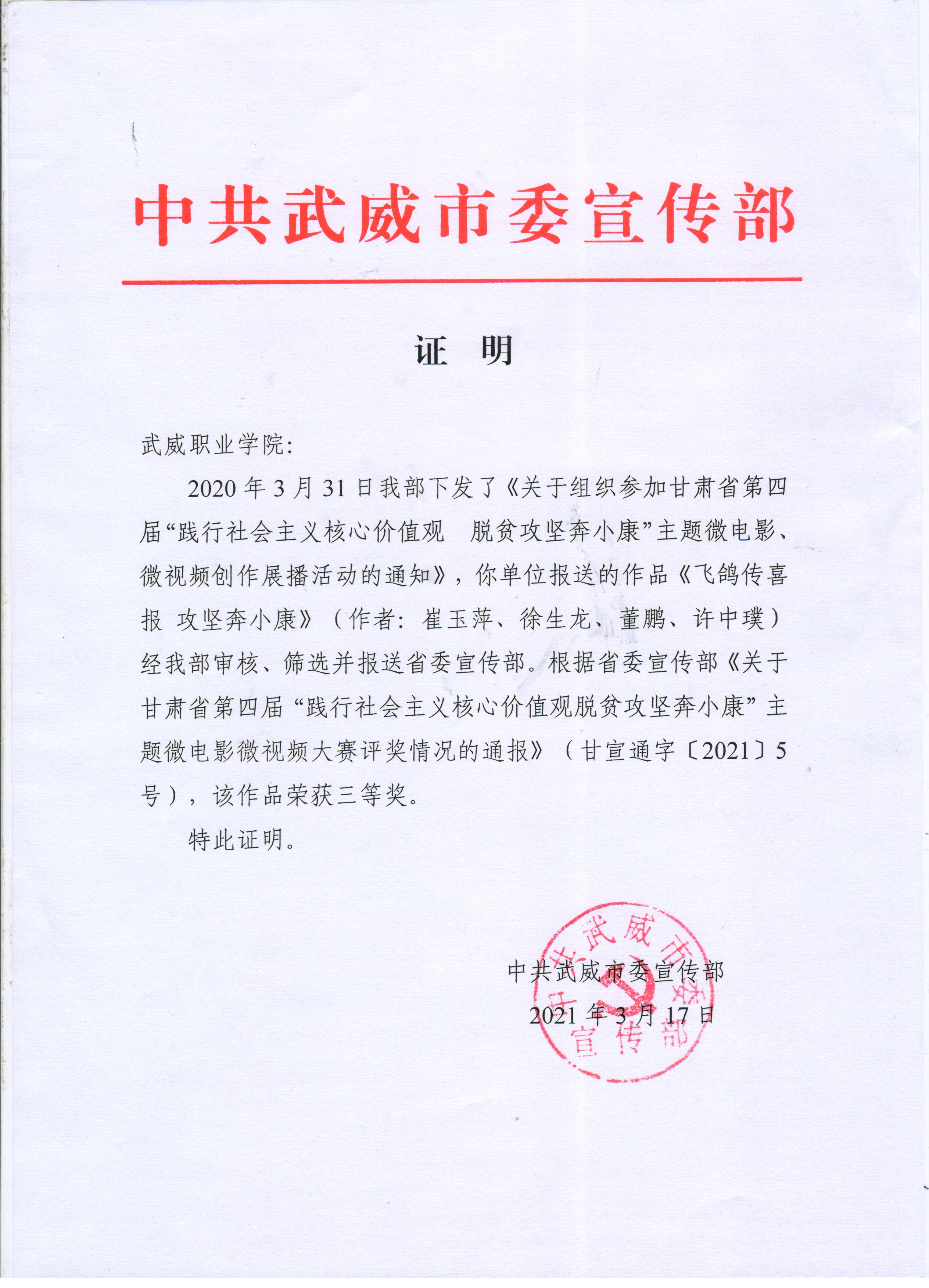 9.項(xiàng)目組負(fù)責(zé)人徐生龍、崔玉萍、董鵬2021年3月制作的《飛鴿傳喜報(bào) 攻堅(jiān)奔小康》在《關(guān)于甘肅省第四屆“踐行社會(huì)主義以核心價(jià)值觀脫貧攻堅(jiān)奔小康”主題微電影視頻大賽》榮獲三等獎(jiǎng)