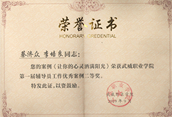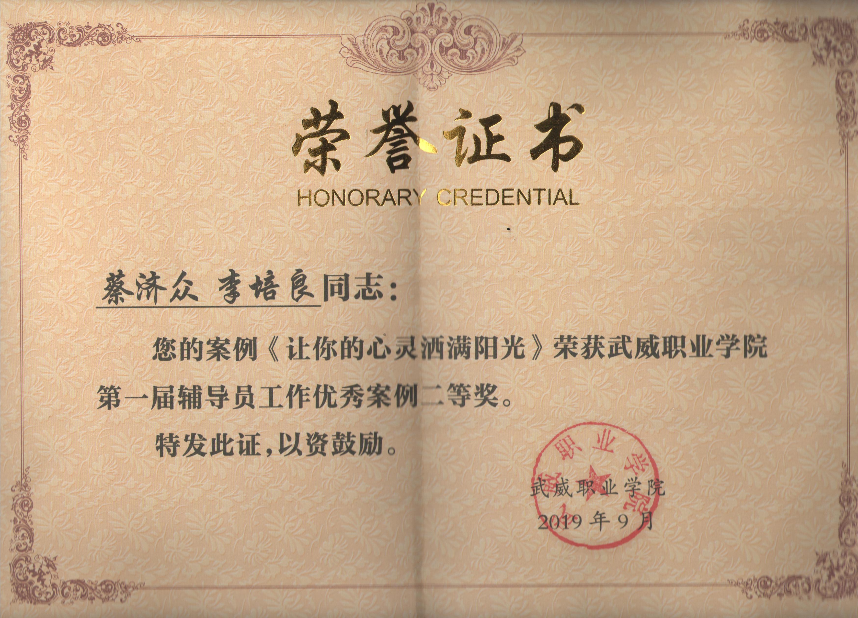 12.項(xiàng)目組成員蔡濟(jì)眾2019年9月撰寫的《讓你的心靈灑滿陽(yáng)光》榮獲武威職業(yè)學(xué)院第一屆輔導(dǎo)員工作優(yōu)秀案例二等獎(jiǎng)