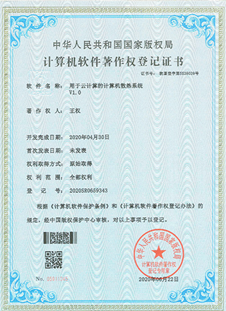 2020年6月項目組成員王權(quán)獲得《用于云計算的計算機散熱系統(tǒng)V1.0》軟件著作權(quán)
