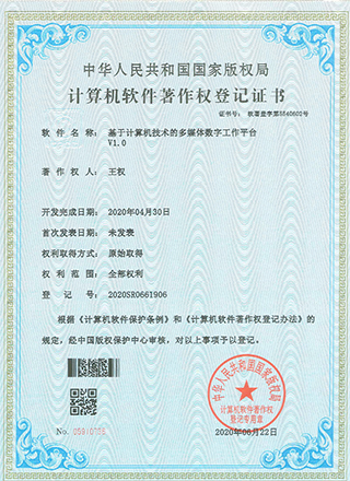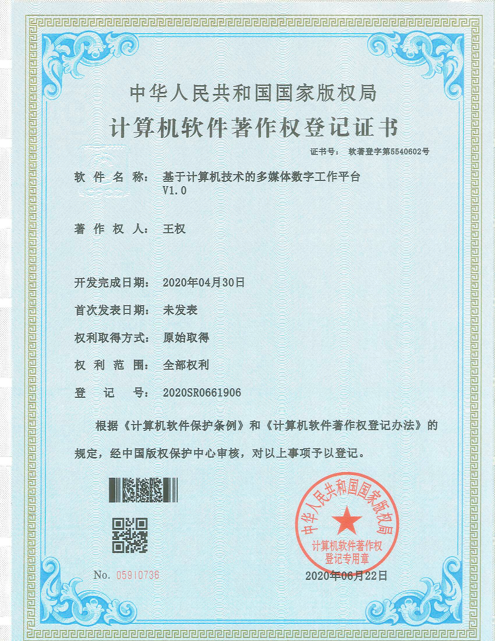 2020年6月項目組成員王權(quán)獲得《基于計算機技術(shù)的多媒體數(shù)字工作平臺V1.0》軟件著作權(quán)