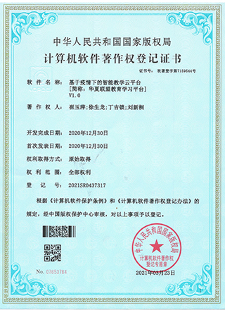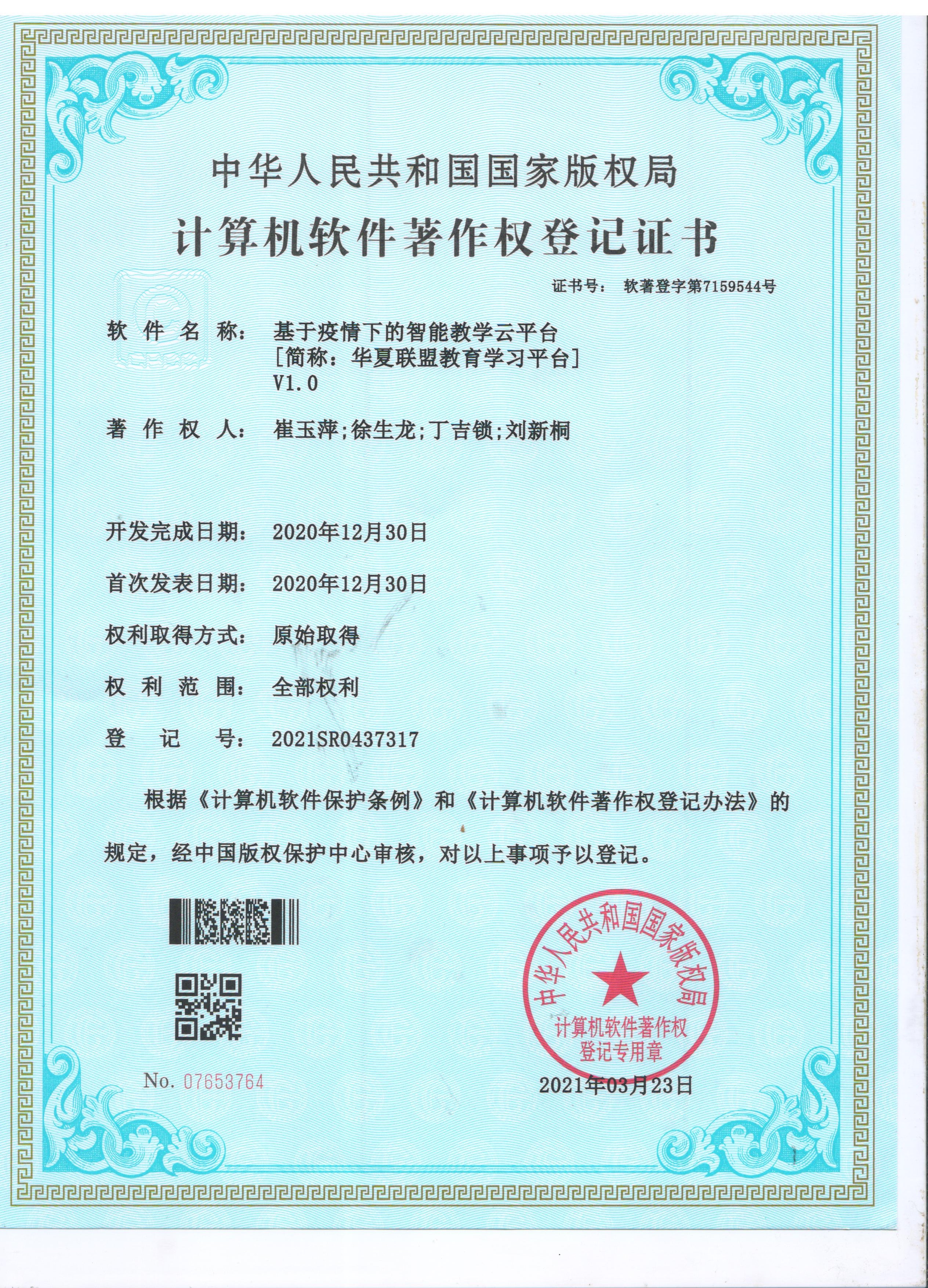 2020年12月項目組成員崔玉萍、徐生龍獲得《基于疫情下的智能教學(xué)云平臺》軟件著作權(quán)